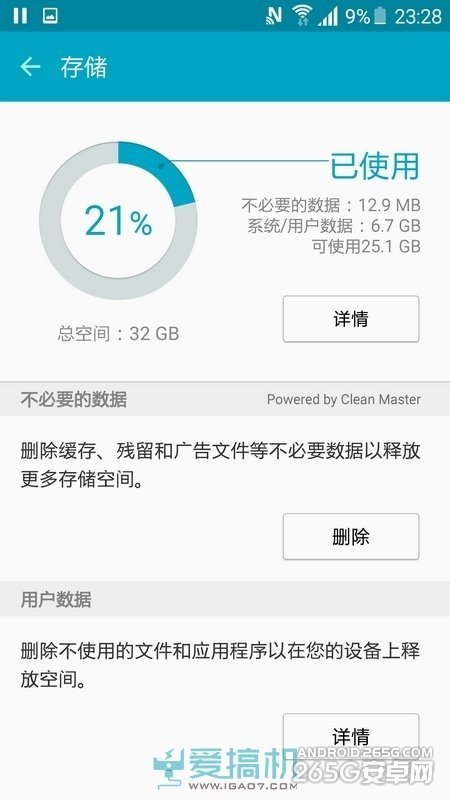 储存管理,引入这个模块主要是因为Galaxy S6摒弃了坚持已久的可插TF卡的设计,引入自动清理残留文件也是一个较好的解决方案。亮点是“Powered by Clean Master”,没错,就是偶们熟悉的猎豹清理大师,Galaxy S6内置了猎豹的清理功能。