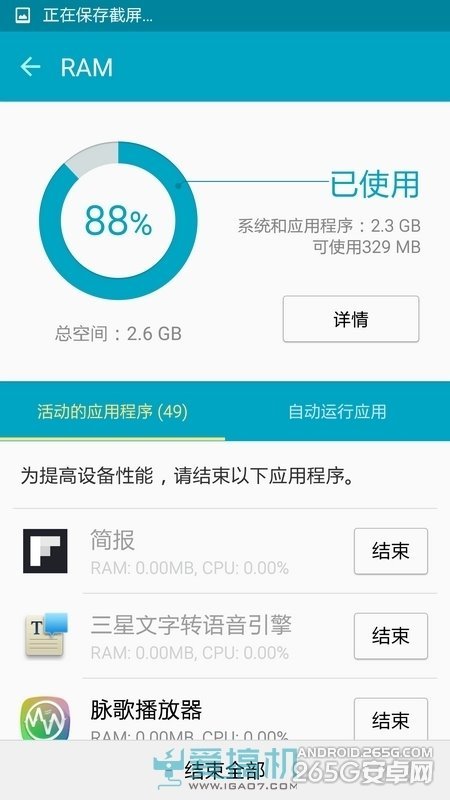 Ram清理功能就应该很好理解了,以往不少用户也吐槽过三星TouchWiz占用Ram过多的情况,按下“结束全部”以后会释放一部分内存。