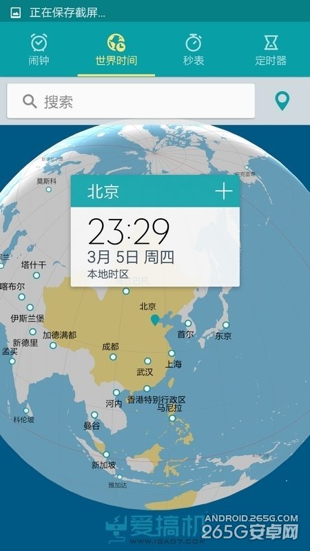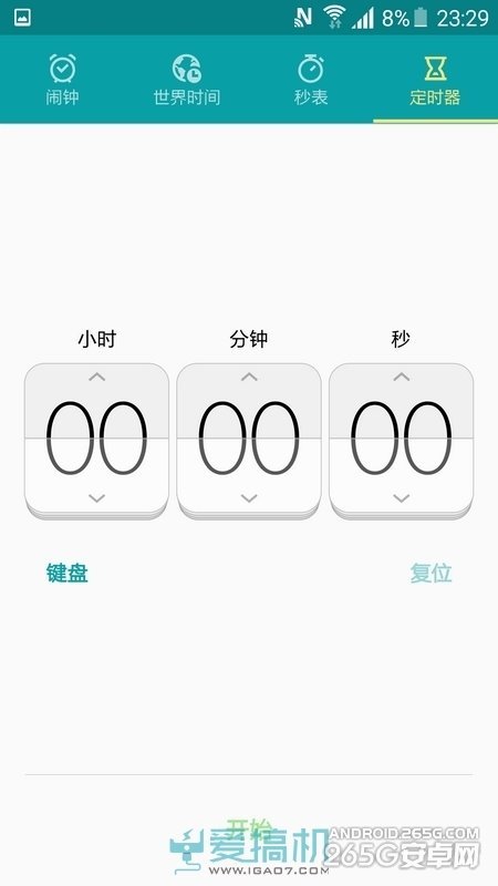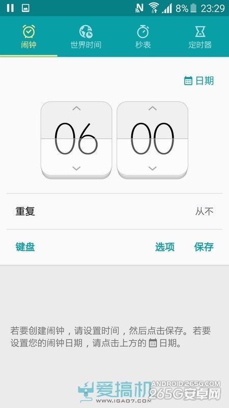 Galaxy S6的时钟应用配色显得比以往更活泼一些,采用白色、灰色和绿色三种颜色配合。