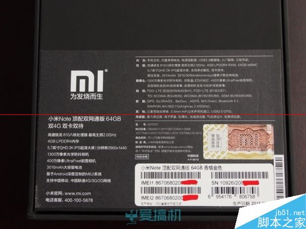 包装背部依然是我们熟悉的配置信息,我们拿到的是小米Note顶配版双网通版64G香槟金色。