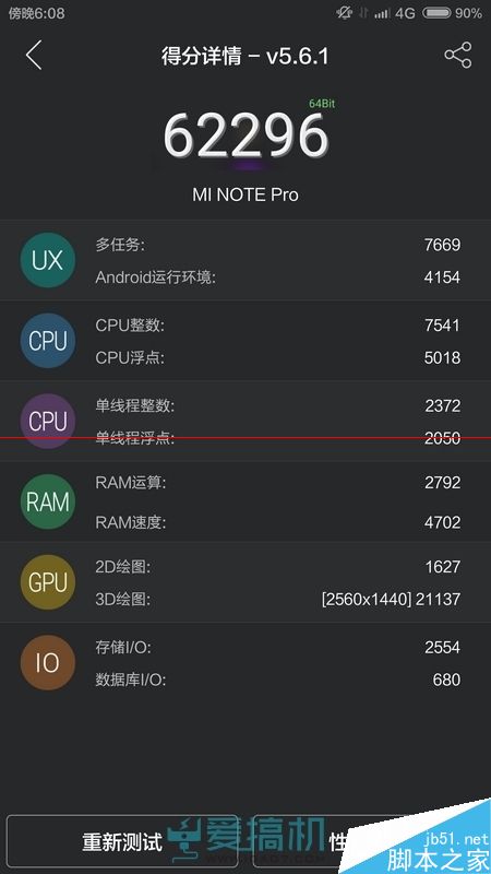我们首先进行常规的安兔兔评测,小米Note顶配版的跑分超过了62000分,成绩还算不错,相比其他使用骁龙810的手机有一定优势,但是和Exynos 7420相比还有差距。