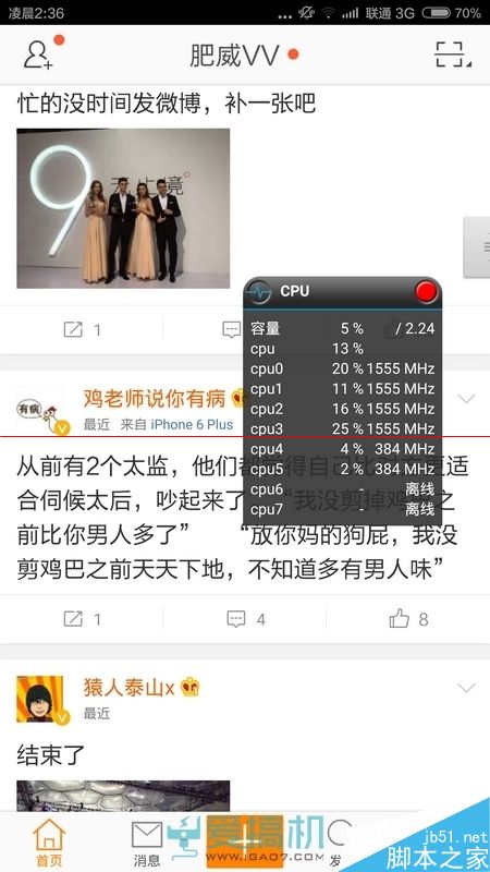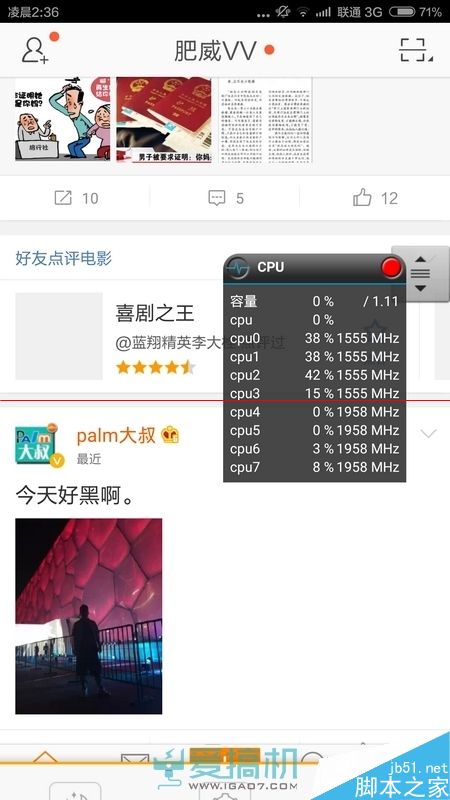 我们打开微博进行测试,可以看出日常应用情况下,小米Note顶配版也有“八核全开”的情况,而且各个CPU核心都维持在较高的频率上。