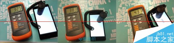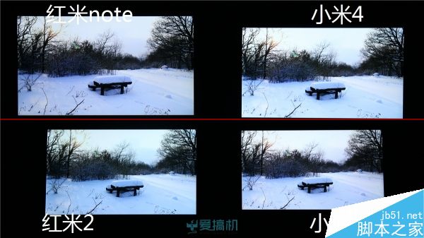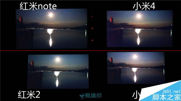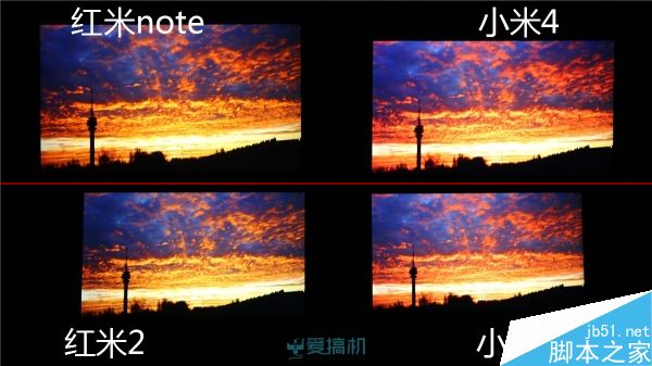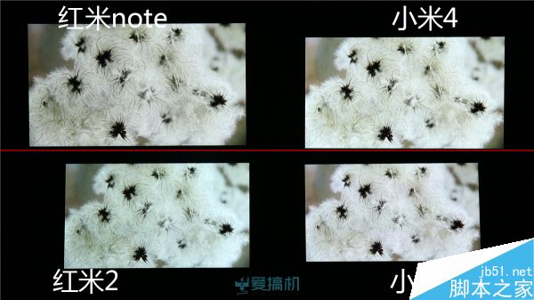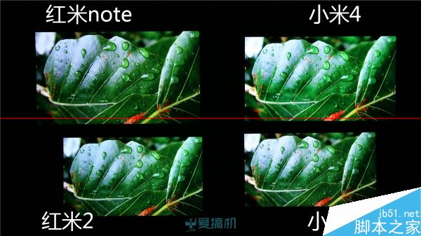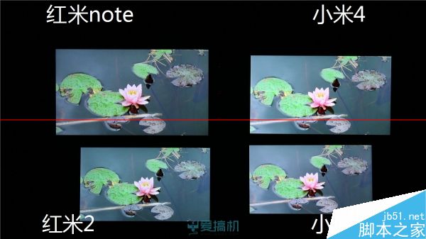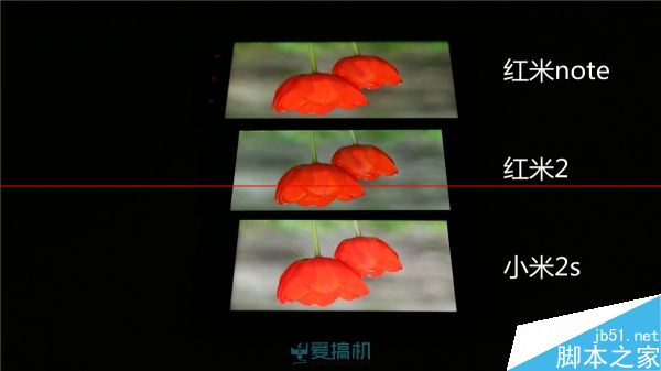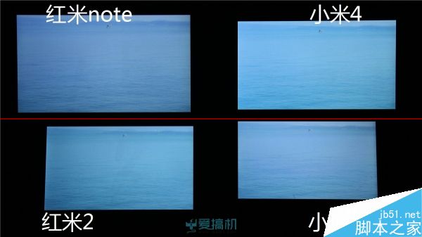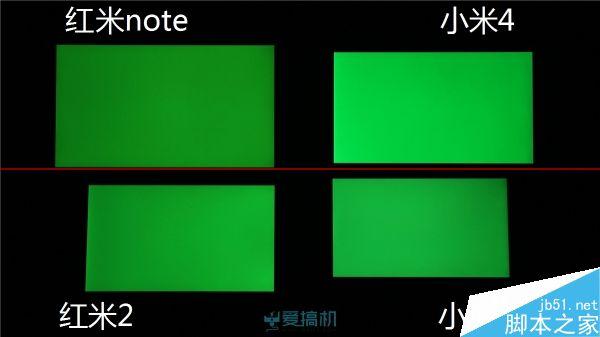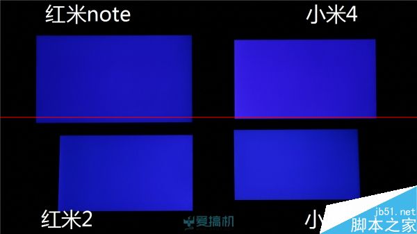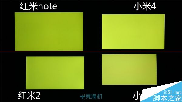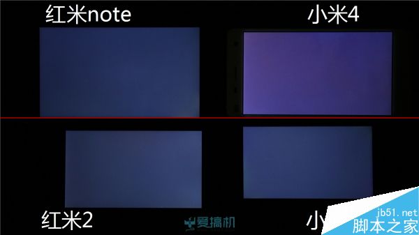 红米2漏光控制比较出色;红米note右下角有轻微漏光;而小米4 继承了 JDI 面板的漏光传统,顶部大片漏光但漏得比较均匀,另外其黑色显示明显泛红。