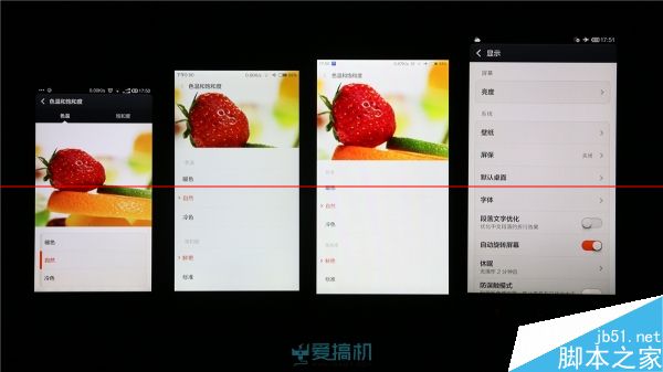 MIUI 自带色温调节选项,测试过程统一采用“自然+鲜艳”模式,红米note因系统阉割无此选项。