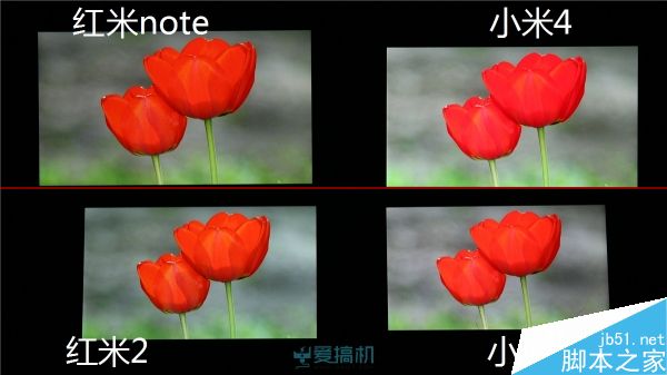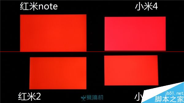 红米2的纯色表现和小米2s非常接近,但显示黄色等合成色的时候不如米2和米4准确;小米4因为有高其他3部机一个级别的亮度,它的颜色会显得更浅,但除了红色外,其他颜色都明显更加准而且艳丽。