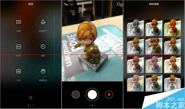 拍照界面是完整的MIUI 6风格,左划调出拍摄模式列表,除了小米4上的魔术对焦功能外,“全景、HDR、声控、美颜、夜景防抖”等功能都在。
