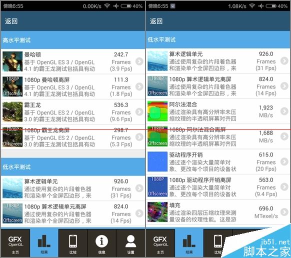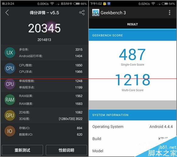 GFXBench的曼哈顿场景1.8帧、霸王龙场景5.3帧;安兔兔(左)20345分;Geekbench单核487分、多核1218分。基本符合骁龙410的正常表现。