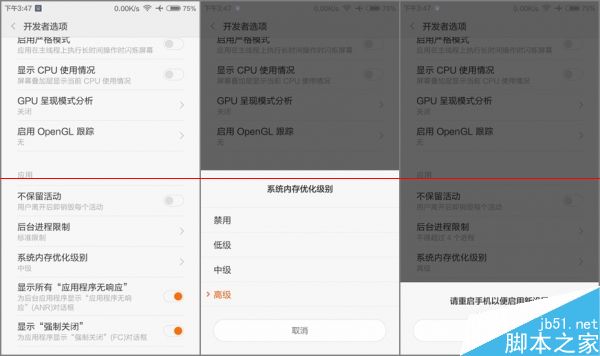 另外,红米2的满血 MIUI 6 中有内存压缩技术,在开发者模式中可以选择不同模式。模式切换需要重启,开机后可用内存可以跑到480m,手动清理一下可以突破500m。
