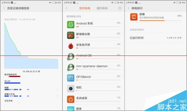 骁龙410的功耗控制相当不错,耗电曲线的断割线左侧(断割线是因为重启进出极简模式)是接近2小时的密集跑分,掉电30%。而更加离奇的是,耗电最高的居然还是翻墙路由器。
