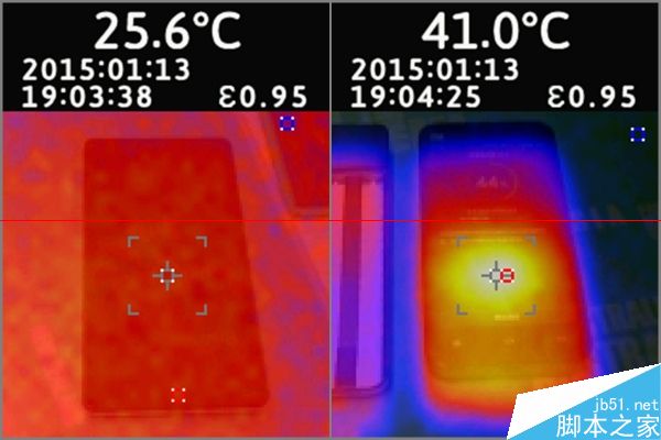 作为对比,静置的红米note为25.6度(即环境温度),而跑分5分钟左右的小米2s的正面就烧到41度了……