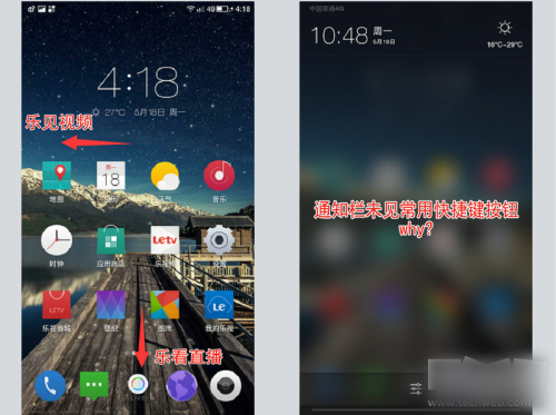 上面图左分别指向了乐见视频、和乐看直播两个选项,对于安卓系统的任意自定义分屏还有图标随意移动,相信只要是玩过安卓手机的用户,都是十分清楚这项功能的,乐视超级手机1搭载的EUI,将乐见视频和乐看直播,直接固定到了界面左侧和菜单栏底部中间,用户不能自定义其位置变化,这是为什么呢?
