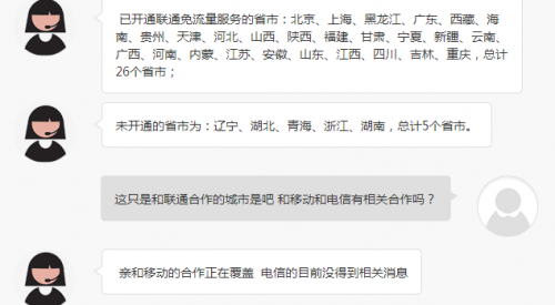 从对话中大家应该都已经看的一清二楚,乐视目前和中国联通有了实质性的免流量干货放出,支持的省市有26个左右;湖北、湖南、辽宁、浙江、青海暂时还没开通。至于另外两大运营商,中国移动和乐视的合作正在覆盖,中国电信依然表现出“高冷”的一面。
