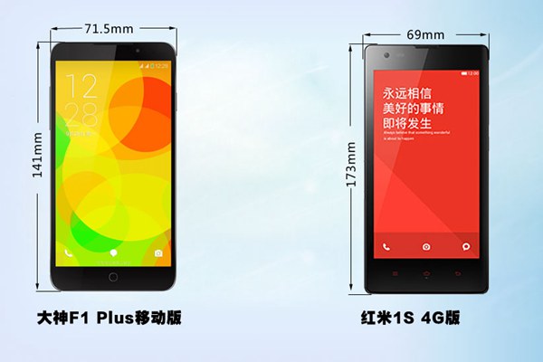 大神F1 plus移动版为141x71.5x9.3mm,红米1S 4G版尺寸为173x69x9.9mm,红米1S 4G版的尺寸稍微小一些,总量方面大神F1 Plus移动版为151g,红米1S 4G版为158g,手感上大神F1 Plus移动版稍微好一些。