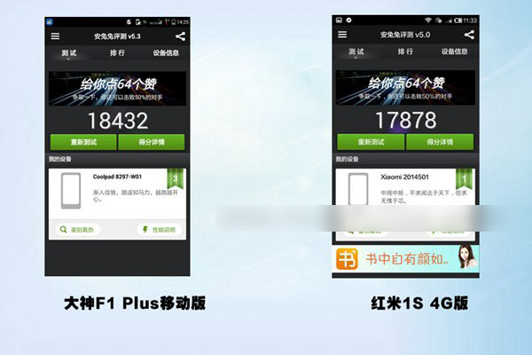 性能方面,大神F1 Plus安兔兔跑分超过1.8万分,而红米1S 4G版安兔兔跑分在1.7万分左右,两者性能相差不大,不过大神F1 Plus要略微好一些,加之64位处理器也更主流。