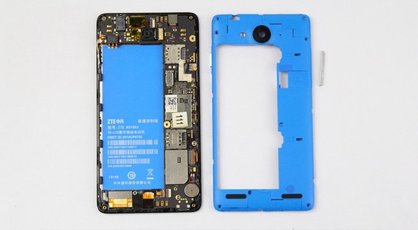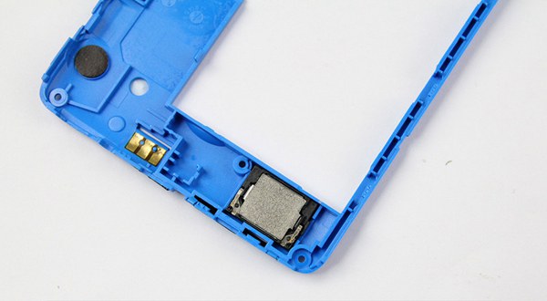 中兴V5S是可拆卸后盖设计,所以拆机下手点也是在打开后盖后的中壳之上。蓝色的中壳显然已经成为中兴V5智能手机的共有元素,从最开始的中兴V5到现在的V5 Max都是这样的设计风格。