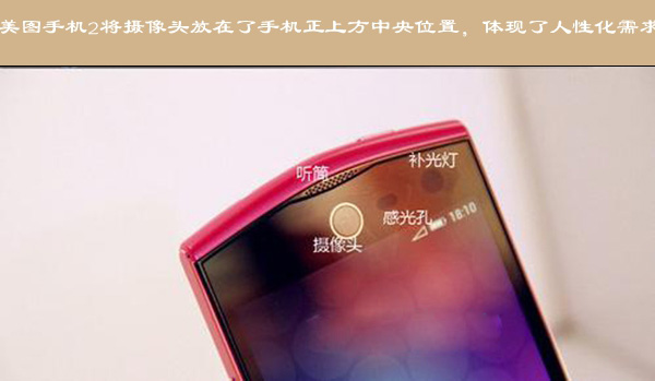 美图手机2正面上方顶端设置一枚听筒,上方正中央位置设置一枚前置1300万摄像头,视角为75.5度。摄像头右侧是一颗感光孔和一枚支持夜间智能补光的前置补光灯