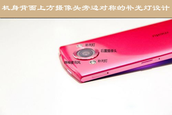 机身背部上方顶端是一枚降噪麦克风,上方中间位置搭载了一颗1300万像素、视角75.5度、蓝玻璃镜片的主摄像头,光圈值为2.0。摄像头两侧对称共设置了两枚补光灯辅助拍摄。