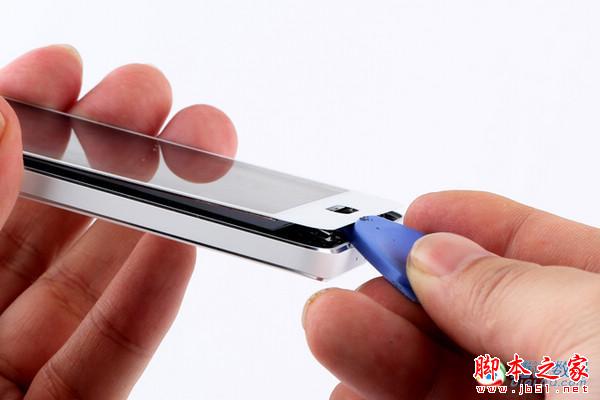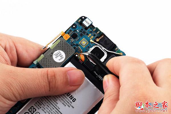 言归正传,接着拆,对屏幕四周施以热风,使屏幕周边的粘胶软化,然后用吸盘吸住屏幕底部轻轻拉起,同时使用塑料拨片沿着屏幕与机身的接缝处慢慢划开,使屏幕与机身分离,注意屏幕排线接口在主机右上侧,取下屏幕前先用镊子分开接口,手机的Home键并没有像以往三星手机那样固定在屏幕中框上,在撬开屏幕时主页键直接就可以取下。