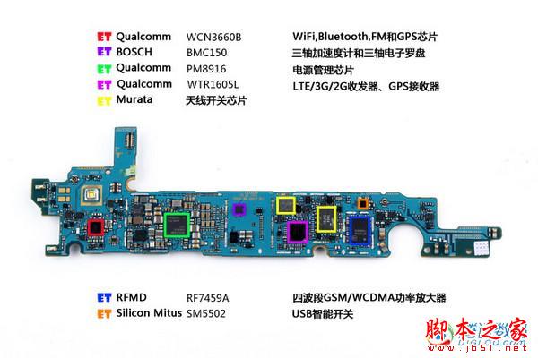 主板背面主要有高通的WCN3660B WiFi、蓝牙、FM和GPS集合芯片;高通的PM8916电源管理芯片;来自于BOSCH的BMC150三轴加速度计和三轴电子罗盘;高通的WTR1605LLTE射频芯片;两颗来自Murata的天线开关集成芯片;一颗来自RFMD的RF7459A的四波段GSM/WCDMA功率放大器;一颗来自Silicon Mitus公司的型号为SM5502的USB智能开关芯片。