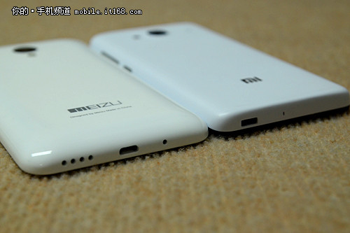 魅蓝的后盖采用聚碳酸酯材质经过抛光打磨等等的工序,显得非常光滑,同时后盖的弧度也是经过精心设计,带来非常好的手感,红米2的后盖采用普通的磨砂塑料材质,而且后盖的角度几乎是直角,上手后会有比较明显“压手”的感觉,手感当然没有魅蓝好。另外大家有没有留意到红米的USB口是一个四方型,插USB线的时候你会不知道哪个是正面哪个是反面。