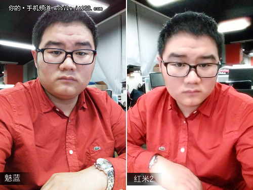 最后是自拍效果方面,越来越多的用户对于手机前置摄像头要求更好,在这里厂商需要满足用户的年龄、心情甚至是十级美颜功能。从参数上来看500万像素的魅蓝要比200万像素的红米2成像质量更高,实际效果也却是如此。但魅蓝也有其弊端,例如典型的“所拍非所得”,成像的照片角度永远与实际物体是相反的(左右颠倒),好在这属于软件问题,希望后期能进一步改善。