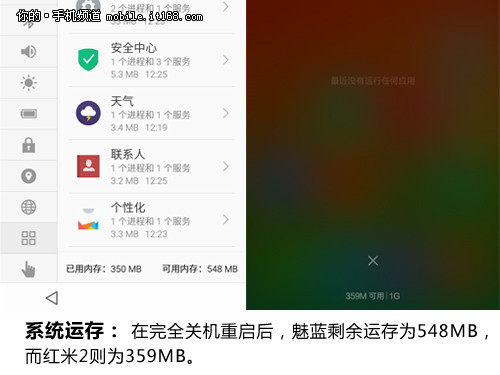 魅蓝配备了1GB RAM,在完全关机重启后,不主动运行任何APP情况下,可用内存为548M,同样配置的红米2为359M,这只是因为MIUI 6系统的自启动程序更繁多,虽然这只是前提,但仍然从侧面反映出对于两款产品,魅蓝留给用户的运行内存要略微多一些。以下是试用过程中的一些体验: