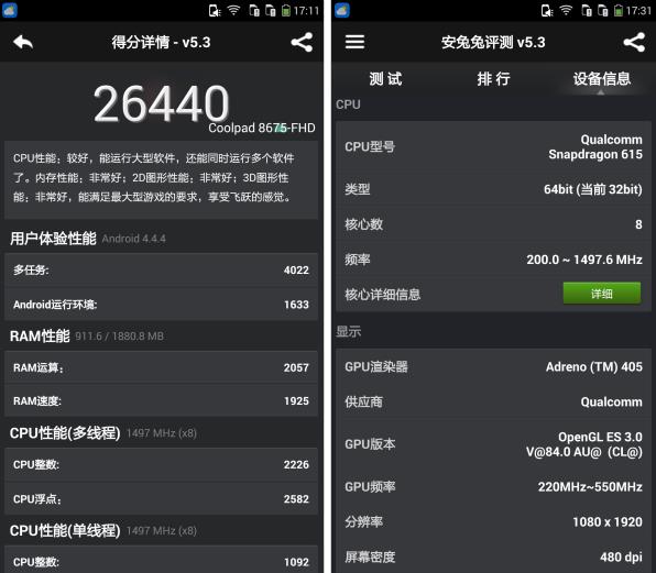 | CPU型号 | 1.7Ghz高通615(MSM893)64位八核 |