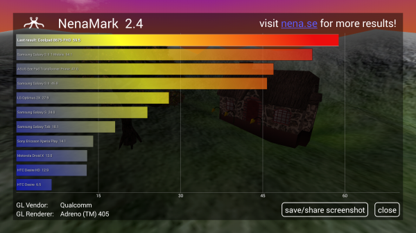 GPU使用了Adreno 405,频率为550MHz。使用NenaMark 2.4进行3D测试获得了59.5fps平均帧数的高分成绩,达到了软件内置排行榜的第一名, 在运行大部分的游戏时都能获得良好的游戏体验。