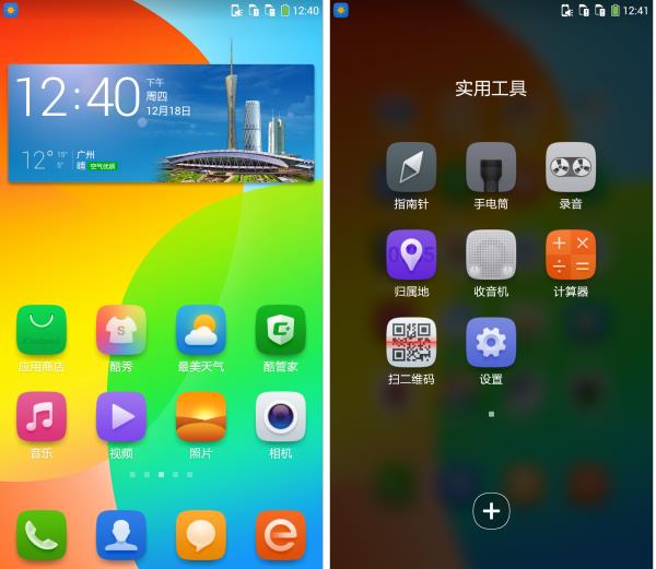 在主界面上,CoolUI取消了二级程序菜单,仅保留了单层桌面,将所有的程序一律放置在了桌面,省去了源生安卓进入程序菜单的步骤,这个改动相信也更加符合当下年轻人的审美。