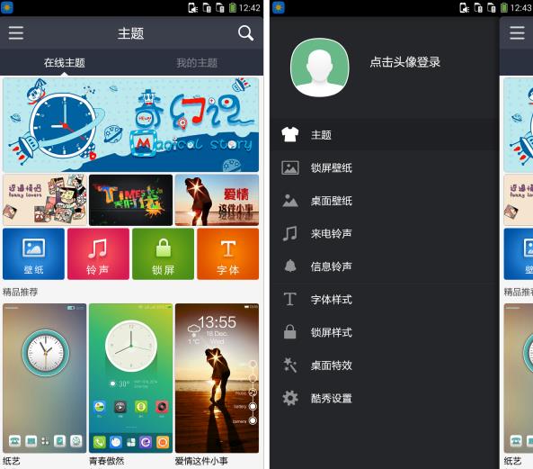 除了默认的锁屏和桌面外,用户还能通过“酷秀”,更改锁屏、图标、壁纸等内容,只需连上网络,即可下载到大量优秀的主题风格。当字体看腻了之后也可以通过酷秀下载到不同样式的字体,自定义性非常高。
