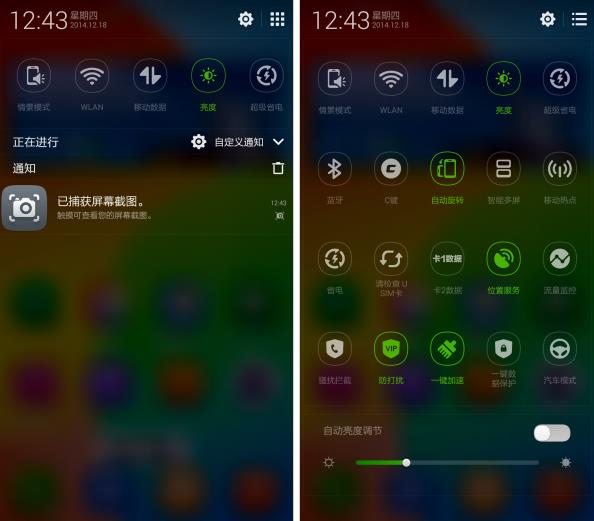 通知栏上提供了五个常用的快捷功能开关选项,点击右上角的按钮后可以显示更多的快捷开关,只要长按图标,便可根据自己的喜好,对图标的位置进行自定义位置排列。另外,通知栏的通知还能进行屏蔽设定,当不想看某些程序的通知信息时,就可以对其进行屏蔽操作。