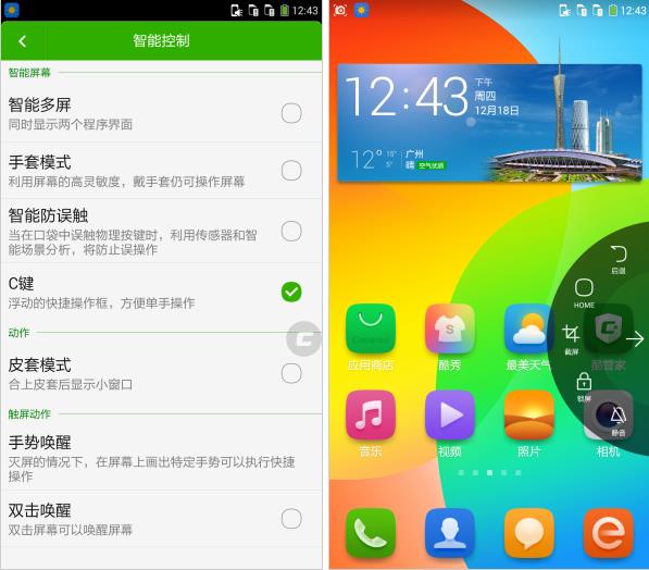 配备了5.5英寸大屏幕的大神F2高清版,专门为大屏手机提供了更适合单手操作的浮动C键。在浮动C键上,融合了用户最常用的一些功能,例如锁屏、截屏、静音和多个虚拟按键,省去了点击屏幕下方实体键的操作。
