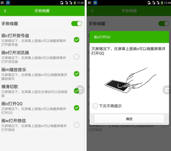 除了为大屏而生的浮动C键,CoolUI还有较实用的手势唤醒功能,顾名思义,就是在熄屏状态下,通过在屏幕上划出提前设定好的手势,即能快速打开程序,比如双击屏幕亮屏,画W打开微信等。