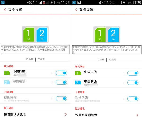 在使用中,需要注意的是,卡槽1和卡槽2均支持联通、移动的2G/3G/4G网络,不过同一时间必须有一张工作在GSM网络。也就是说,如果卡槽1和卡槽2分别放置电信卡和联通卡时,可以使用电信的2G/3G/4G网络,联通则只能使用2G;注意,此时即使电信卡选择“仅2G制式”,联通卡也仅能使用2G网络。但如果反过来,卡槽1和卡槽2分别放置联通卡和电信卡的话,联通卡可以使用2G/3G/4G任一制式,但电信卡是不能用的(其2G不是GSM)。