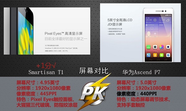 锤子手机T1采用了4.95英寸1080P全高清屏幕,其具备Pixel Eyes触控面板、大猩猩三代玻璃、防指纹涂层等特性。而华为P7采用的是5英寸1080P全高清屏幕,具备动态屏幕调节技术,支持头套触控等。