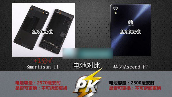 锤子手机T1内置2570mAh不可拆卸电池,而华为P7内置的是2500mAh不可拆卸电池,两者电池容量基本相当。