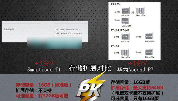 锤子手机T1拥有16GB/32G版本可选,不支持存储卡扩展,而华为P7只要16GB版本可选,不过最大可支持64G存储扩展。