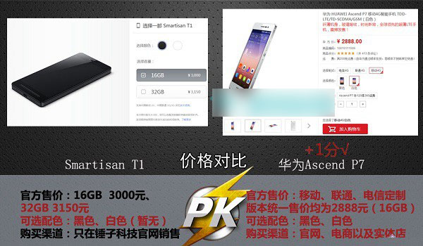 锤子手机T1售价还是比较贵的,售价3000元起,其中3G网络制式的16GB版锤子手机售价3000元,32GB版售价3150元,目前只能通过锤子手机网站购买。而华为P7售价2888元,并且拥有移动、联通和电信定制机,可以从华为商城、各大电商网站购买。
