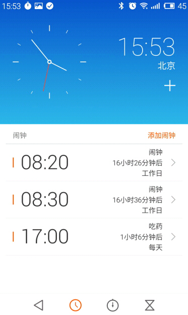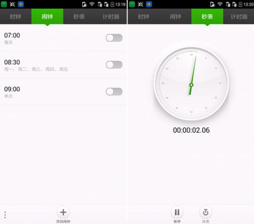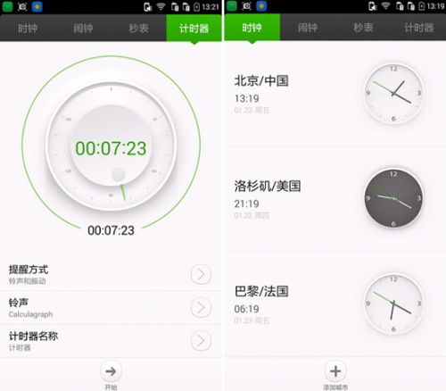 基本上所有Android平台的时钟应用都融合了时间现实、世界时钟、秒表和计时器的功能,操作方式各有不同,但是实际上功能一样。畅玩4X的时钟根据手机主题优化,黑色界面为主色调,为了推出稳重大方的风格;魅蓝Note设计有些凌乱,世界时钟和时间集中在一起风格不统一,简洁的风格也没有体现出来;大神F2的整体设计统一简洁,虽然有些兀突但一目了然;MIUI尽管设计样式上风格是统一的,不过不同的功能用了不同的表现手法,看上去有点乱糟糟,但也有人认为这是区别功能的鲜明特征;乐檬K3的时钟设计扁平化到了极致,堪称简洁时钟的典范,一切样式都为了功能,没有一点冗余,不过与“美观”二字无缘。
