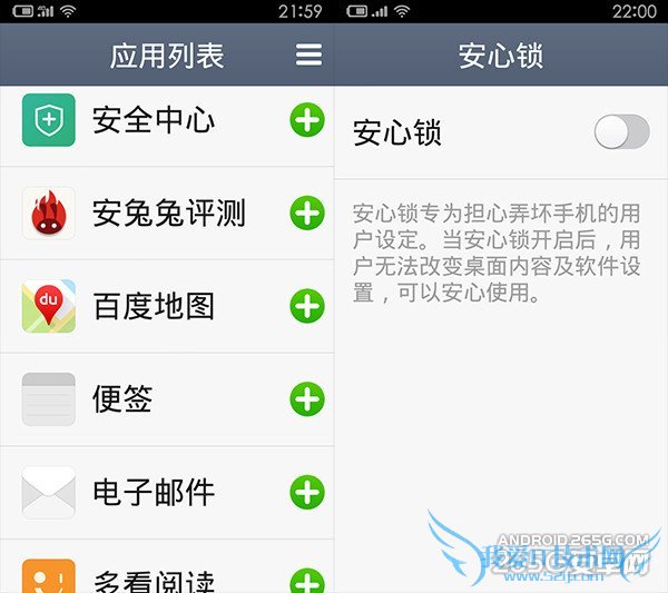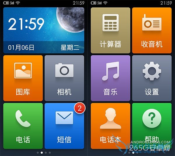 由于市场定位的原因,红米2内置了极简模式与普通模式两种运行方式,点击进入极简模式后,系统会切换至另一种操作方式,更适合老年人群体使用。极简桌面的设置也比较简单,没有过多的繁琐操作。极简模式下带有安心锁的开关设计,打开后可以不再担心桌面或其他设置被误操作更改的麻烦,可以说是为老年人贴心定制的一个功能。