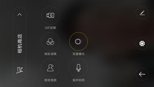 当切换到前置摄像头时,只有极致美颜、绚彩滤镜、GIF动画、留声拍照、双重曝光五种拍摄模式,其中极致美颜包含弱、中、强三个美颜等级,用户可根据自己皮肤的好坏来选择,这样即使不化妆也能和亲朋好友分享自己美丽的一面。