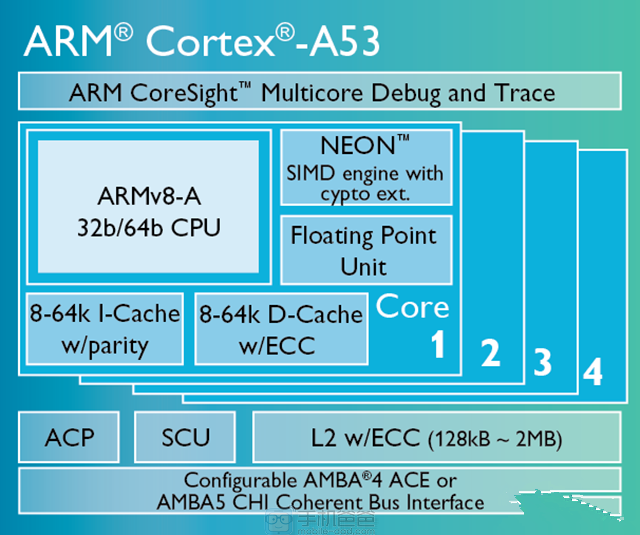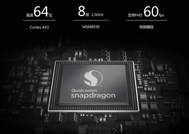 它所搭载的骁龙615处理器搭载ARM Cortex-A53架构,这个架构属于Cortex-A50系列,仅次于目前ARM性能最好的Cortex-A57。Cortex-A53是号称是目前世界上能效最高、面积最小的64位处理器,同等性能下能效是当今高端智能手机的三倍。