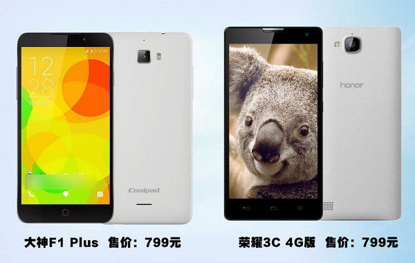 酷派大神F1 Plus售价799元,而华为荣耀3C 4G版同样售价799元,两者的价格是相同的,并且都是一款千元4G手机,如下图所示。