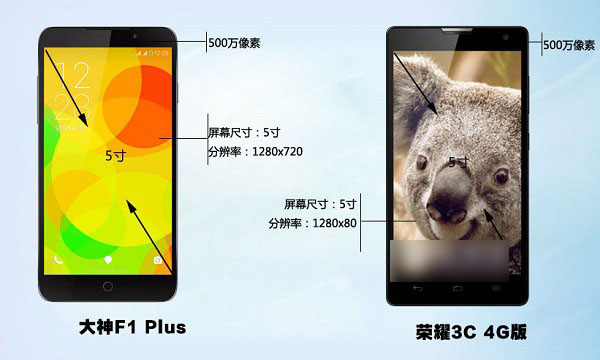 大神F1 Plus和荣耀3C 4G版同样配备5英寸1280x720分辨率的屏幕,并且屏幕PPI也完全相同,屏幕表现可以说大同小异,另外两者连前置摄像头像素也相同,如下图所示。