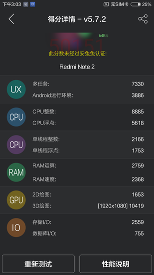 实际测试看,红米Note2得分44160分,基本属于中高端产品性能范围,双通道内存令RAM部分表现也明显好过同价位千元机。实测由于MIUI7现在仍处于调试中,所以真实赛车3和混沌之戒2两款大型游戏全部闪退;日常操作中手机运行顺滑,简单的逃离神庙游戏在高画质环境下跑过4000米也非常流畅。