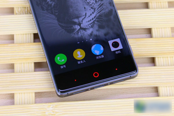 这里我们说“几乎”,是因为nubia Z9结合2.5D弧形玻璃,实现了视觉观感上的无边框效果。屏幕的显示区域外围的黑边被称为“BM区”,首要作用就是防止屏幕漏光。nubia Z9并不是舍弃了MB区,其实你贴近屏幕看或许还能看到零点几毫米、根本算不上黑边的的小黑线,但由于2.5D弧形玻璃的弧面及反光效果,在正常持握手机时,你会觉得这款手机根本没有边框,显示屏直接与机身侧面的金属框相连接,屏占比也确实很出众。顺便一说屏幕下方的三个按键大家都应该很熟悉了,中间的红色圆圈是HOME键,两侧的小红点分辨是返回键与选项键,不使用时会自动隐藏。