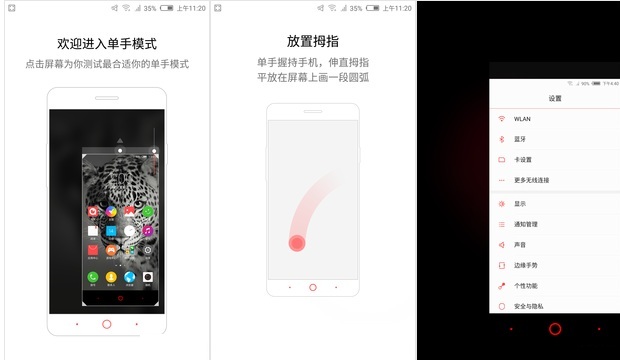 像是两侧边框上下滑动启动app这种我们就不说了,大家看视频就好。这里但说的是连续两次握紧手机启动单手模式的操作,用户只要连续两次快速握紧手机,初次启动单手模式时,界面中会先跳出欢迎界面,随后会出现一个空白界面,让用户单手持握手机,伸直拇指,在屏幕中画出自己单手拇指可触碰的区域;随后nubia Z9会根据用户绘制的这一个区域来自动生成单手模式迷你界面的位置与大小尺寸,贴合每一个用户的不同单手需求。