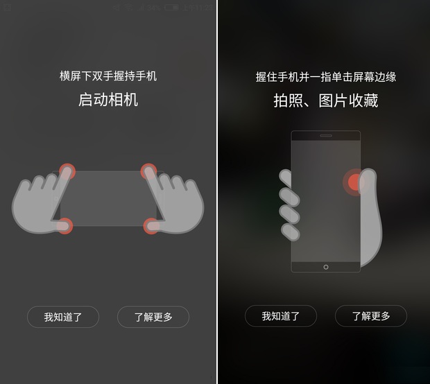 另外就是横握启动相机与单机屏幕进行拍照的组合技能,横向持握手机,手指接触屏幕边框的四个点,即可启动相机,随后在取景界面,手指只要触碰到屏幕边框,就能完成拍照。如果用户想要连拍,只要一直把手指按在屏幕边缘就OK了,反应很灵敏。