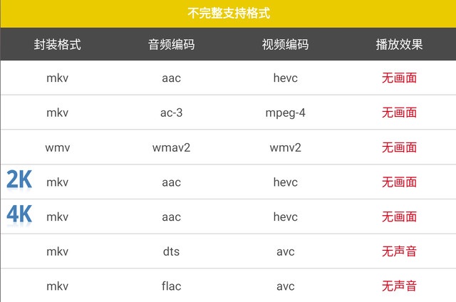 nubia Z9不支持的音视频格式组合(可通过第三方播放器软解播放)