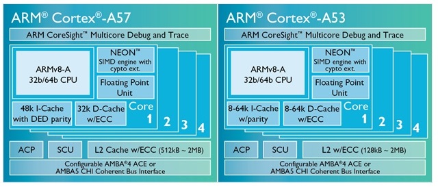 骁龙810借鉴了ARM研发的Big.LITTLE架构设计,拥有四颗Cortex-A57 CPU核心、四颗Cortex-A53 CPU核心,最高主频2.0GHz,这两组CPU核心可以根据智能手机要处理任务的强度来智能开启和关闭。在进行一些对硬件性能需求不大的操作时,处理器可能只有一颗Cortex-A53 CPU核心处于开启状态,而其他核心处于关闭状态,这样既可以满足任务进程的性能需求,又可以最大程度的节省处理器所消耗的电量。而当用户在运行大型游戏等“重量级”操作时,八颗CPU核心则可能同时开启,以保障用户在玩游戏时能获得流畅的娱乐体验。当然这两组核心也可以交叉工作,比如一颗Cortex-A57 CPU核心可以和两颗Cortex-A53 CPU核心同时工作。
